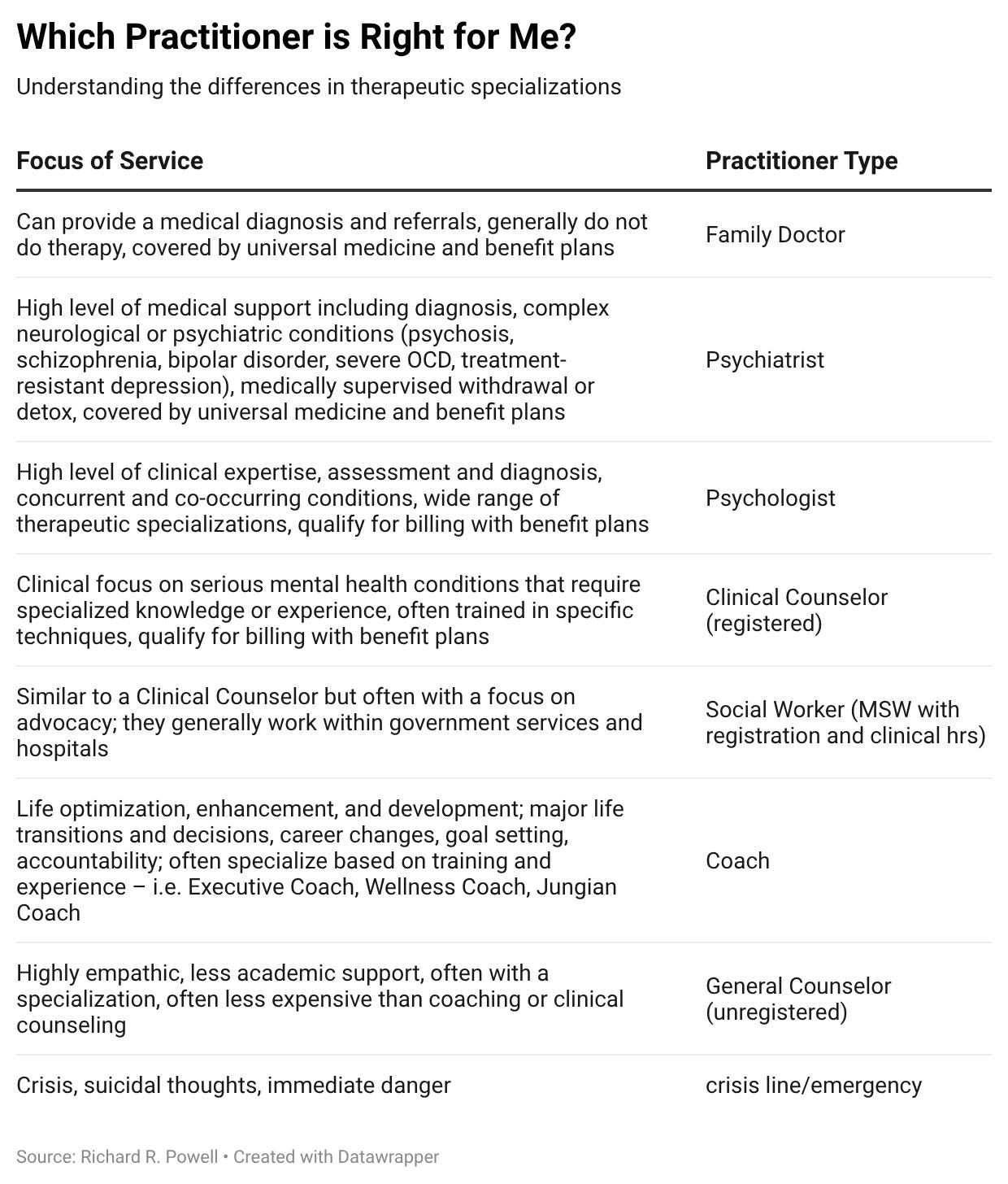 Most people benefit from seeing a counselor or coach or both. Which practitioner you choose depends on your needs, your goals, and your level of stability. Here is a table I created to give a general overview of all the different types of therapeutic practitioners.